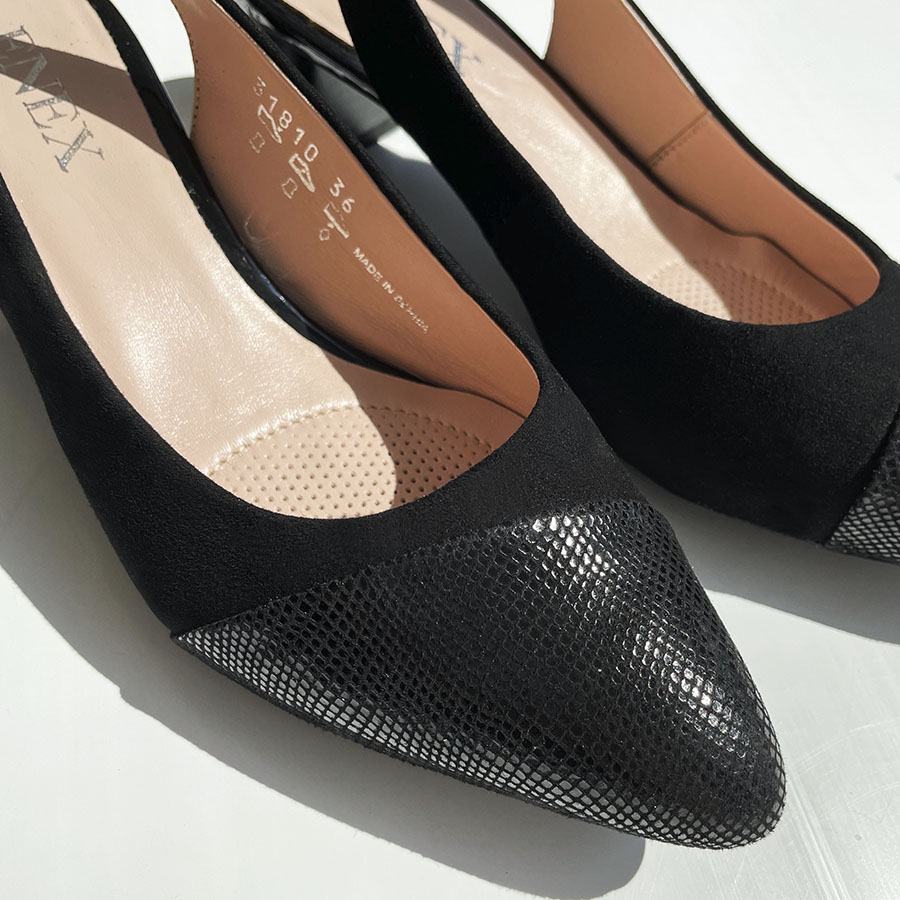 Veoma udobna ženska sandala u bež veluru sa špicom od bež kože. Stabilna štikla srednje visine.